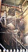 壇箱という部分は箱というぐらいですから、正面左右に彫刻がぐるっとまわるわけです。それまでの立川流彫刻というのは、壁面に装飾するというのが基本ですから、横からも見ることが出来る彫刻を作ることはなかったのです。正面と左右を上手に結ぶためには、角が一番難しい問題です。その角を絵画的にうまくつなぐために、この力神をもってきたのではないかと思います。この力神を置くことによって、正面の彫刻と左右の彫刻がスムーズにつながって、バランスが非常によくなります。下から上に持ち上げるという力の部分には少し欠けはしますが。